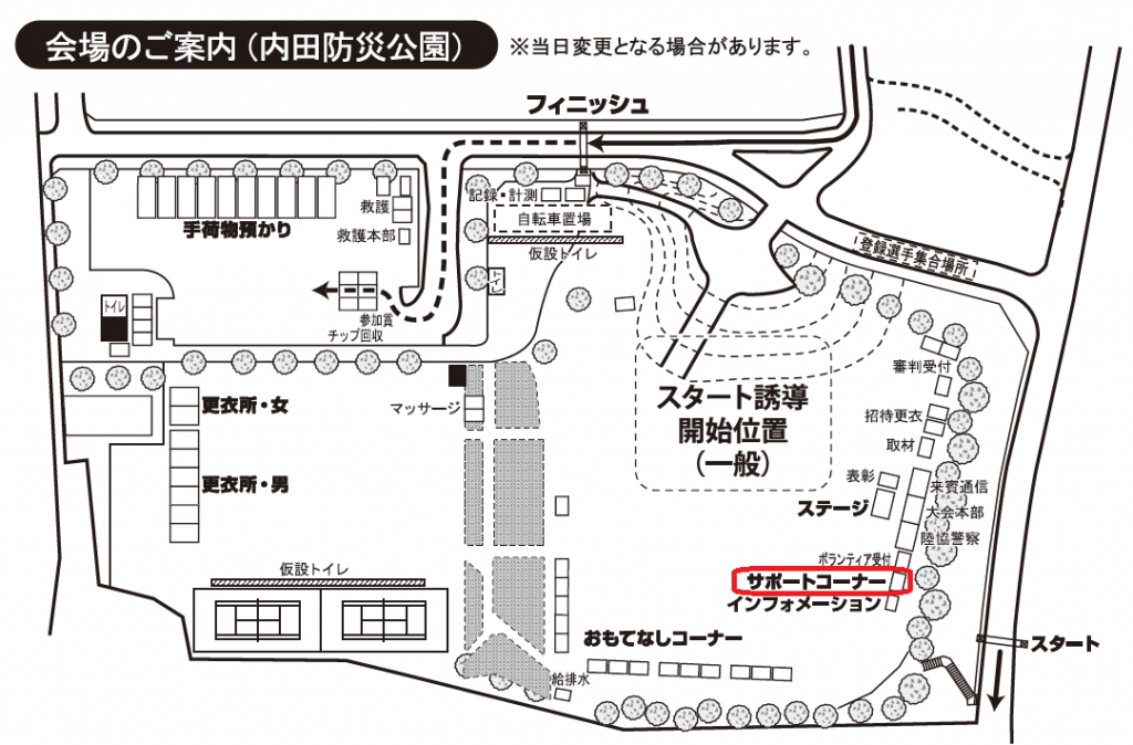 スタート前は、会場内トイレ、手荷物預かり所が大変混雑します。