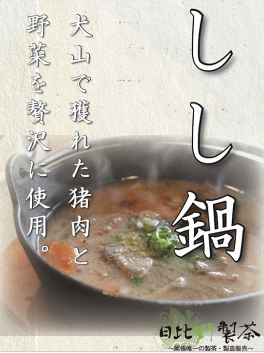 犬山で獲れた猪肉と野菜をふんだんに使用したしし鍋と犬山産の茶葉(抹茶、ほうじ茶、煎茶、和紅茶、香り米)を贅沢に使用したお茶屋のジェラートを販売いたします。