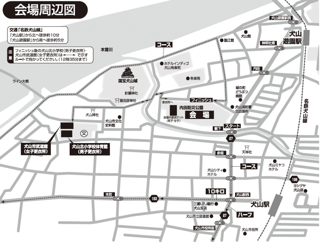 会場の更衣テント以外にも、犬山北小学校体育館(男性更衣所)、犬山市武道館2階(女性更衣所)でも着替えが可能です。ご利用ください。